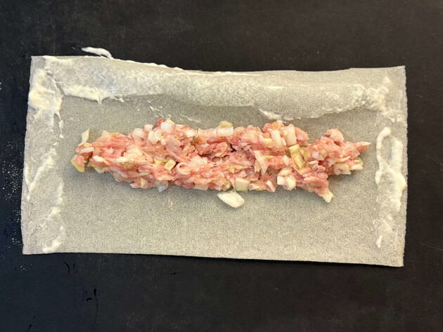 春巻きの皮の中心部分に②具材を棒状になるように置き、両端の部分と巻き終わりになる部分にのりを塗っておきます。