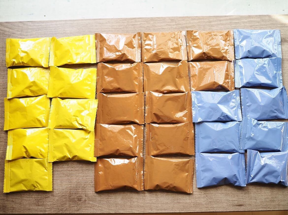 便利な個包装で、黄色がプレーン、茶色がチョコチップ、紫がレーズンでした。