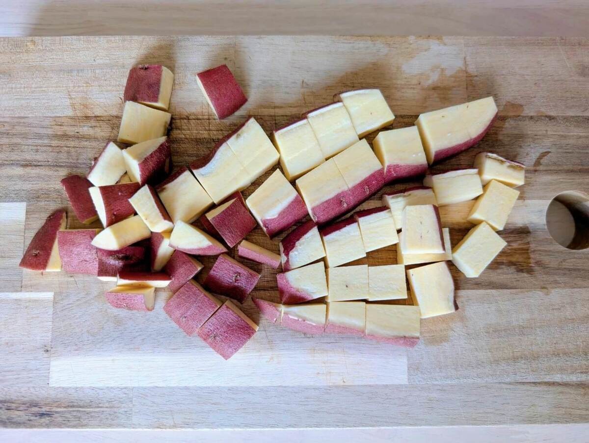 さつまいもはよく洗って、皮を剥かずに1.5cm角に切ります。そのあとは水にさらし、ザルに上げて水けをきりましょう。