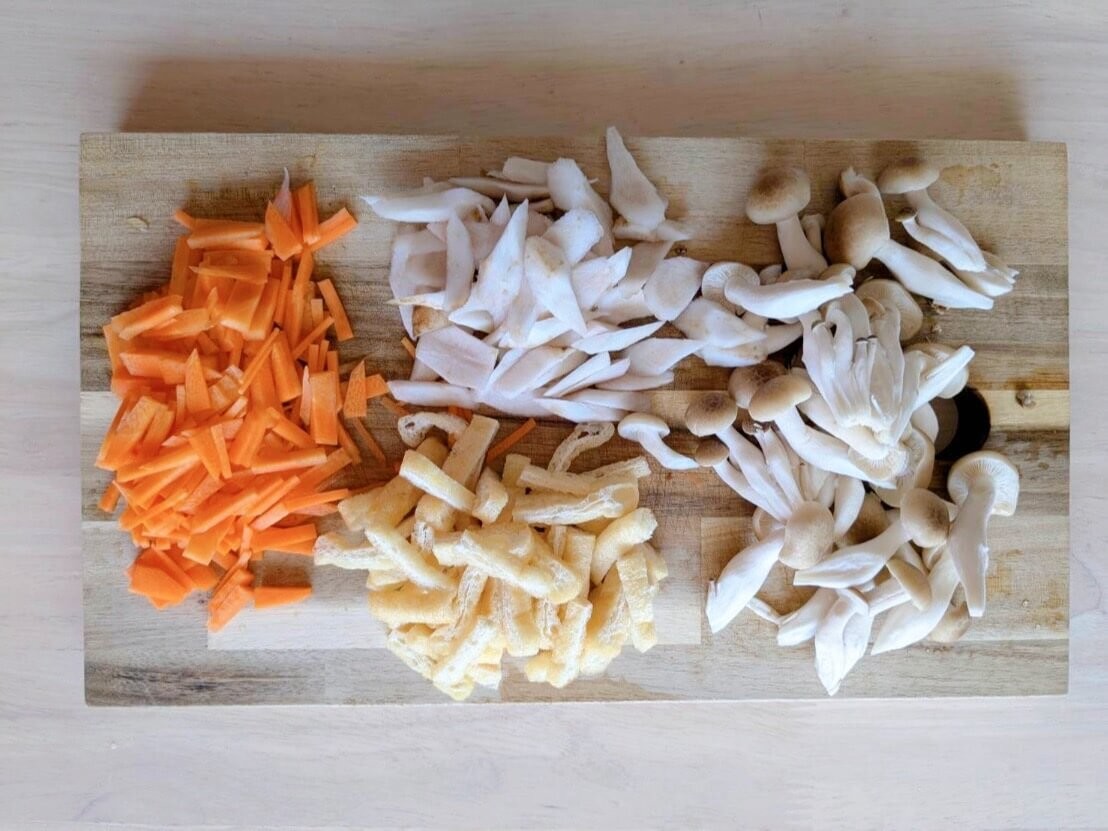 油揚げは縦半分に切って細切りに、にんじんは皮をむいて細切りします。