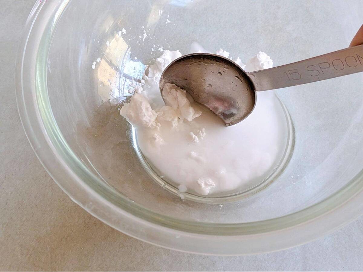 ボウルに片栗粉と酒を1:1の割合(酒が若干少なめ)で入れ、よく混ぜます。少し溶けにくいので、粉っぽさがなくなるよう丁寧に混ぜてくださいね。