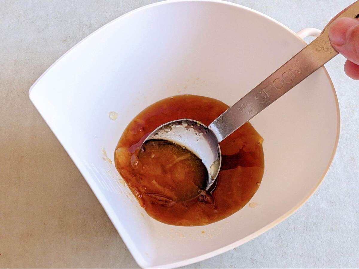 焼いている間にタレ作り。醤油、酒、マーマレードジャムを1:1:1の割合で合わせ、よく混ぜましょう。