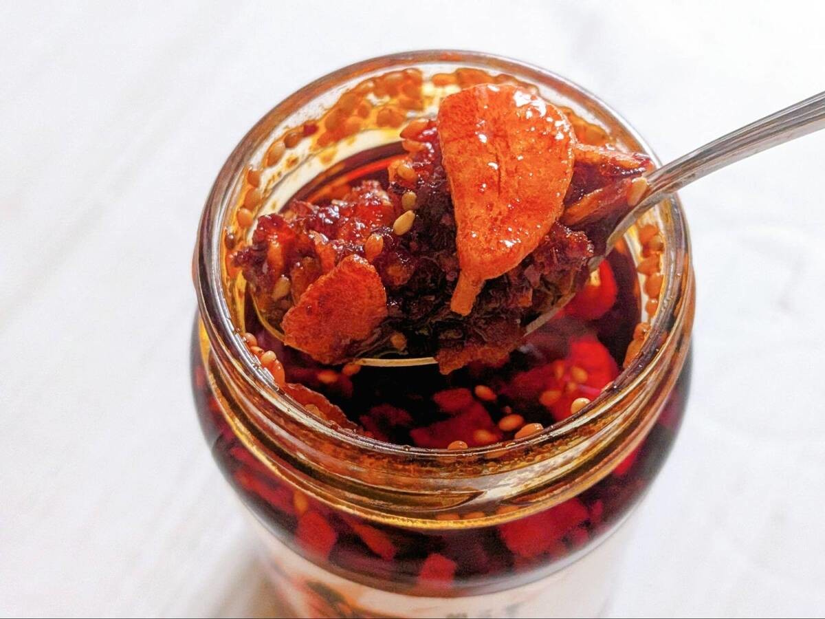 こちらはいわゆる「食べるラー油」のようなもの……なんですが、フタを開けるとぎっしりとフライドオニオンが詰まっていました。