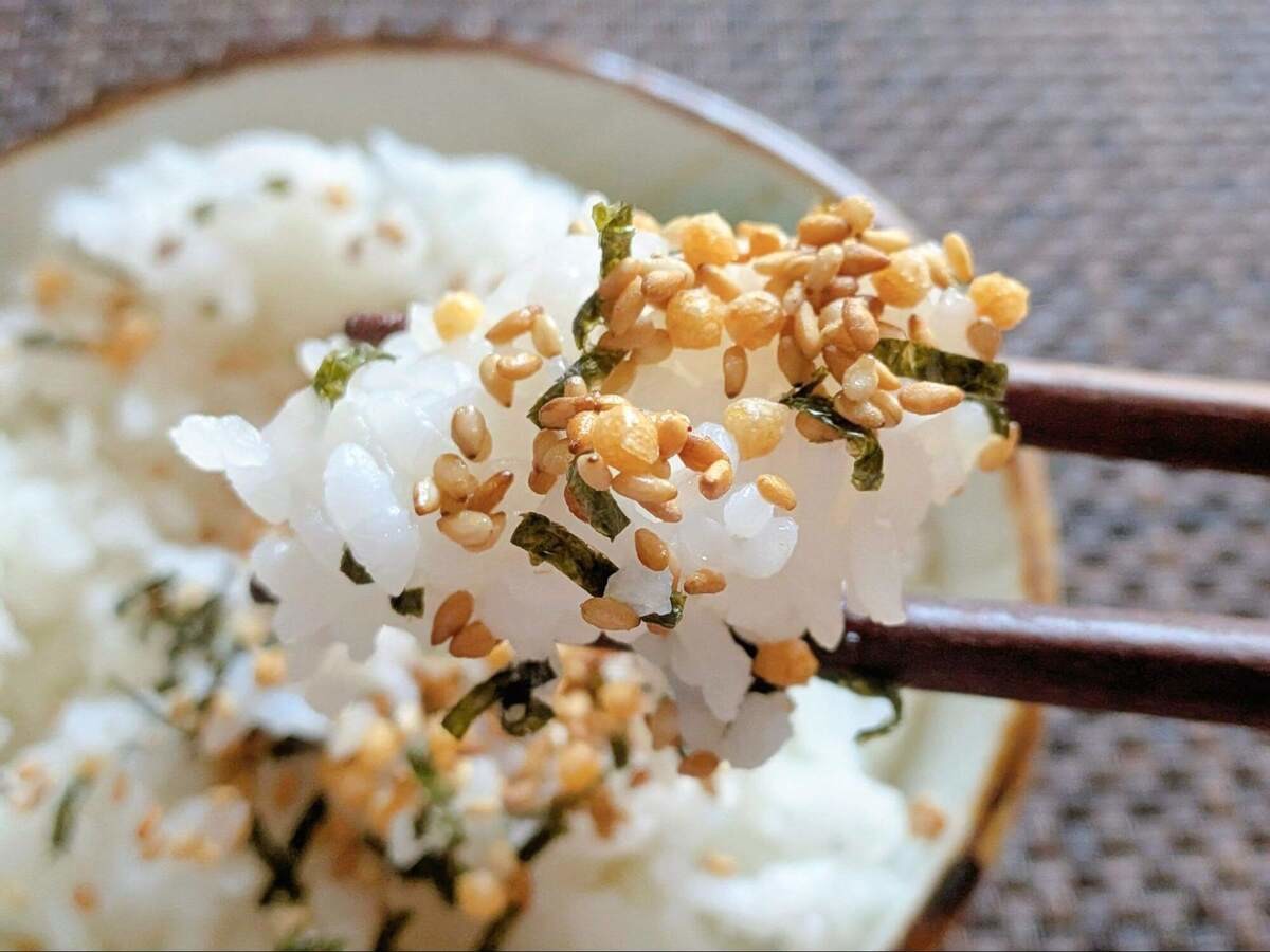 ホカホカごはんにふって食べると、まずゴマの香ばしさとあられのサクサク食感に驚きます。