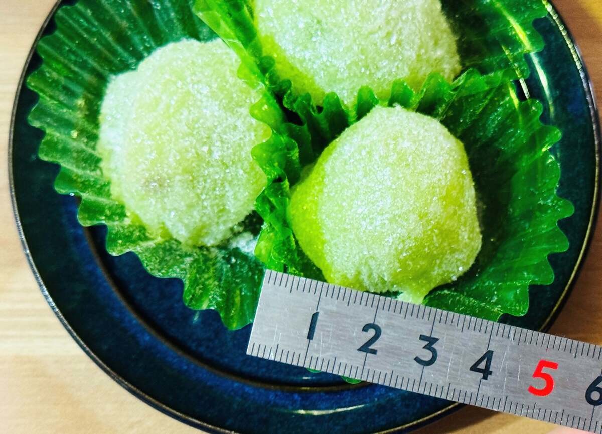 そんな人気のぶどう餅は、1個あたり約3~4㎝ほど。シャインマスカットを丸々1粒使った贅沢な逸品です。