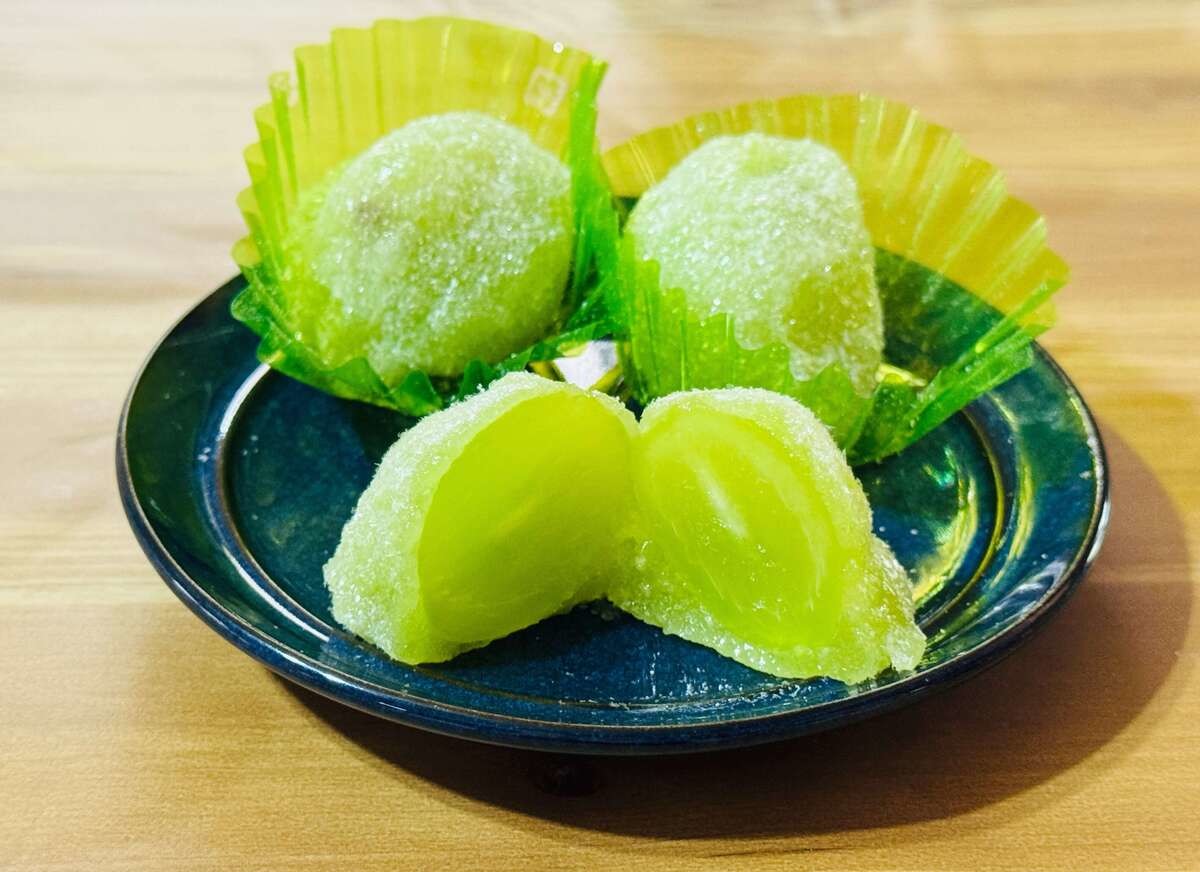 もっちりとした求肥で、シャインマスカットを包んだぶどう餅。