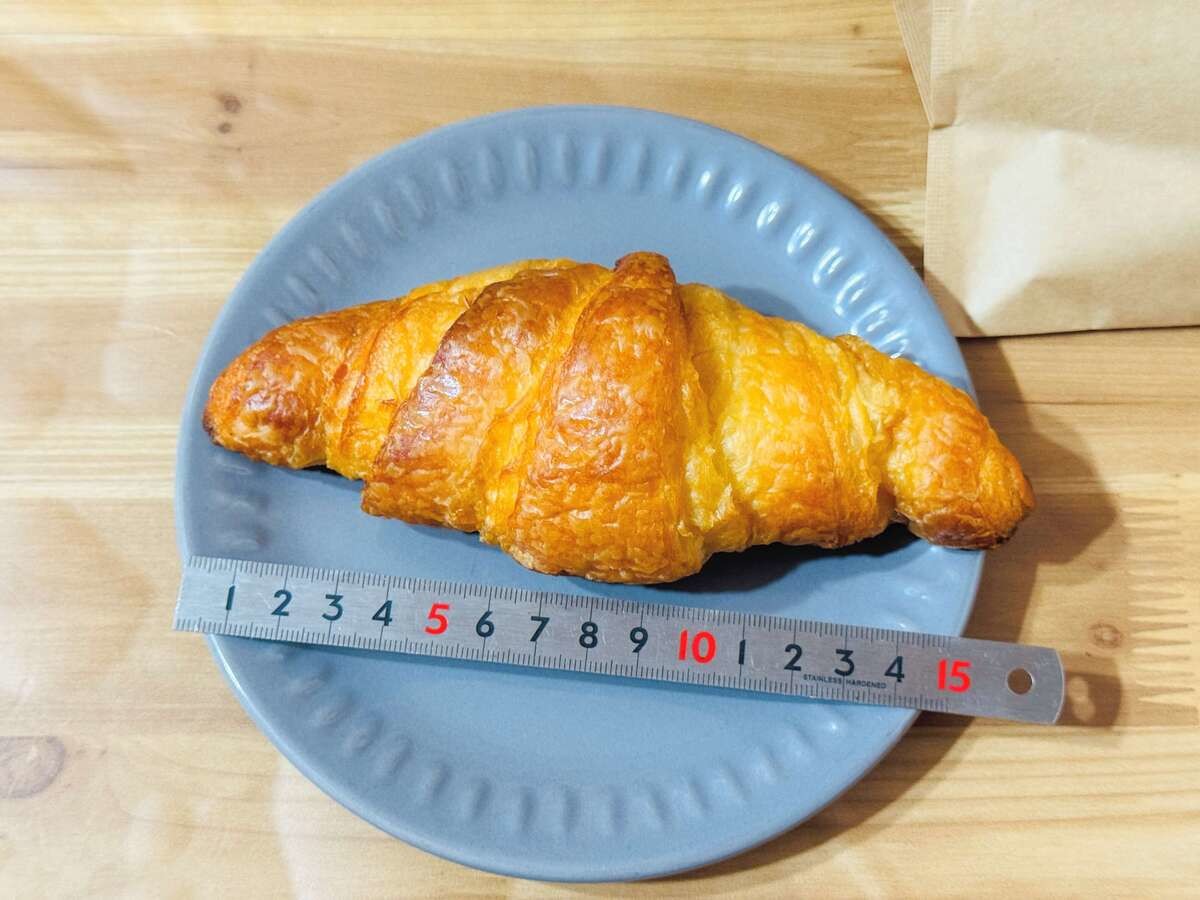 実物は横の長さで15㎝以上。 コンビニのベーカリークロワッサンにも、このくらいのサイズ感のものがありましたが、もう香りが全然ちがいます。