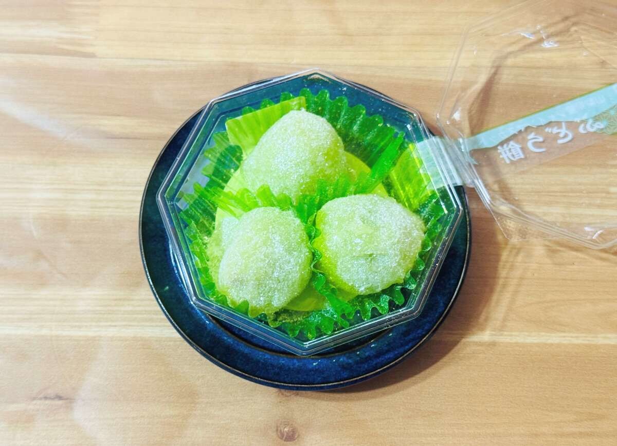 山梨県産の種なしシャインマスカットを求肥で包み、表面にはオブラートと砂糖をまぶした一品。