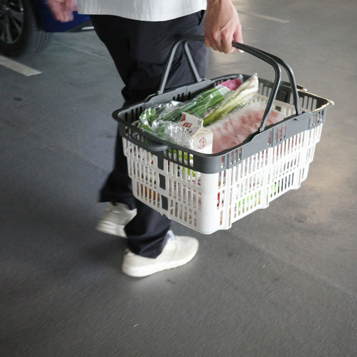 カゴの持ち歩きもスタッフによりさまざま。ぜひ参考にしてくださいね。