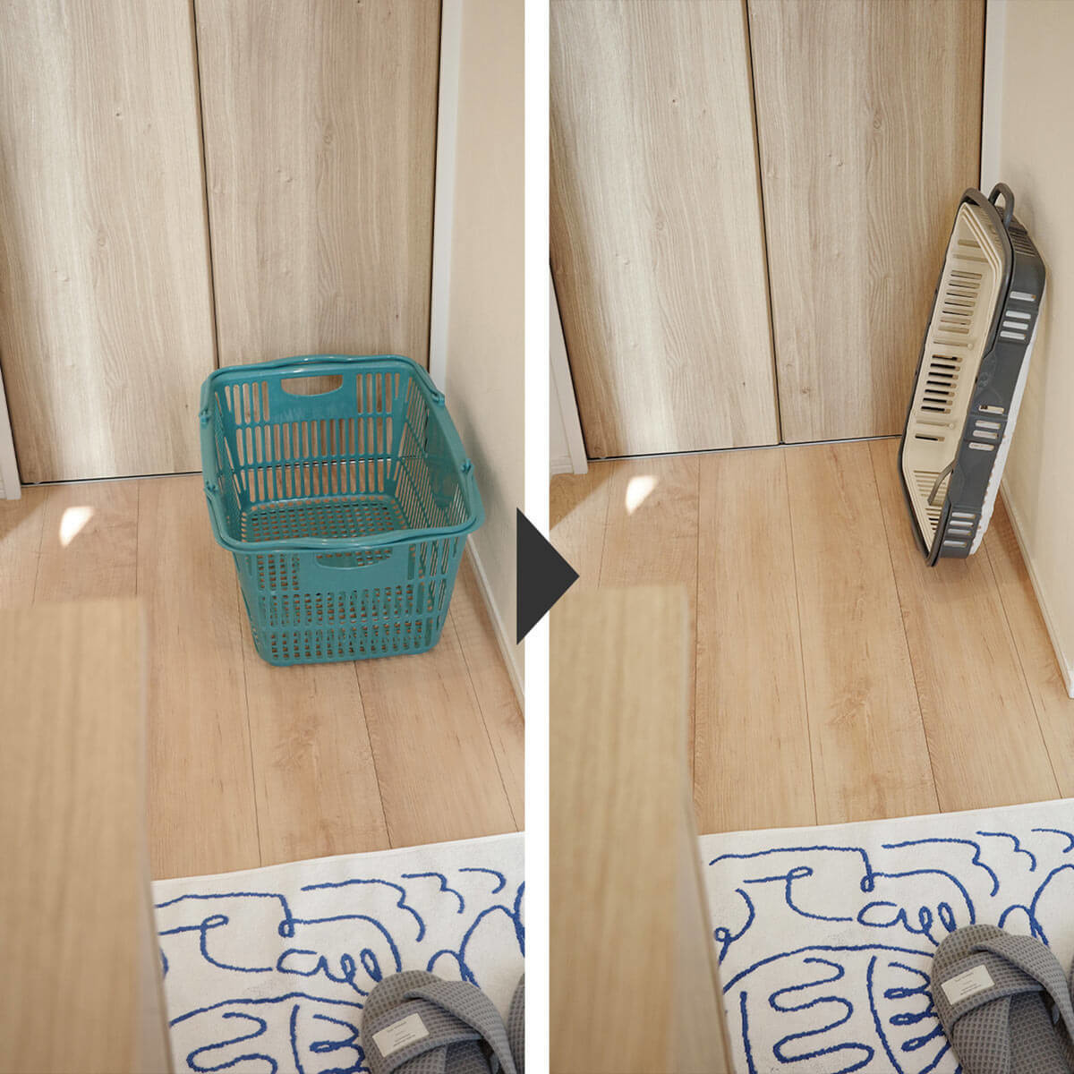 でも、この「折り畳めるレジカゴバスケット」は畳むと厚さ約7.9cmに。落ち着いたカラーも相まって、玄関に立てかけておいても気にならなくなりました。
