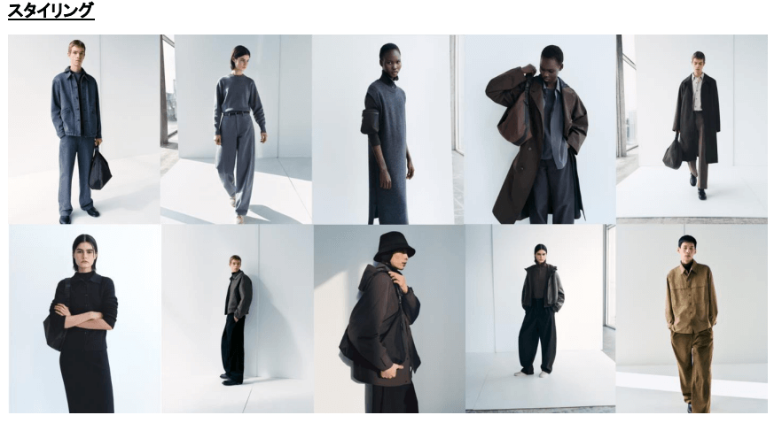 それぞれに異なる素材をトーナルカラーで組み合わせた、Uniqlo Uならではのスタイルが提案されます。