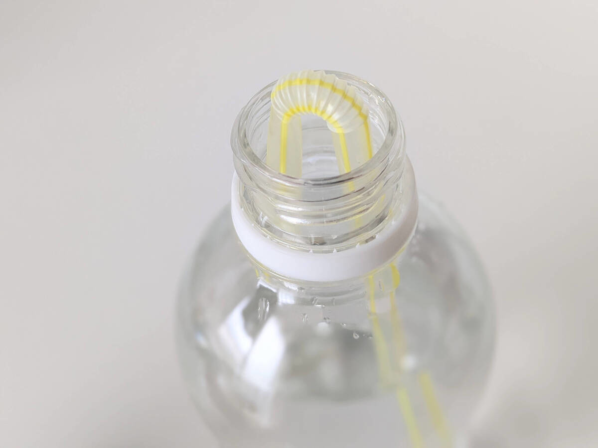 このままストローを曲げずに、蛇腹部分が下になるようにペットボトルに入れます。