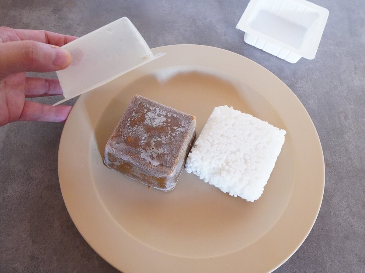 豆腐パックなら、1人分ぴったりのごはんとカレーをそれぞれ入れられます。