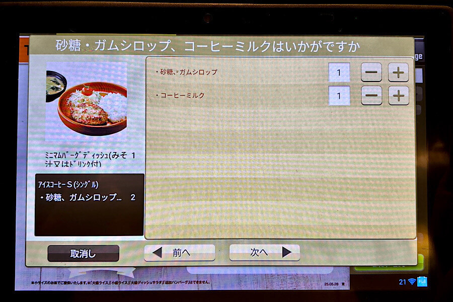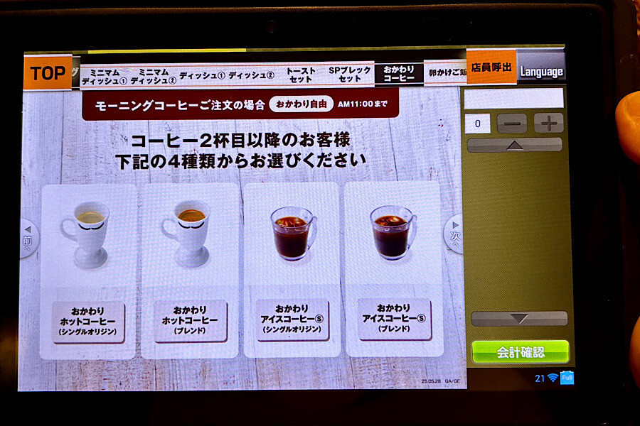 メニューのタッチパネルから「おかわりコーヒー」を選びます。