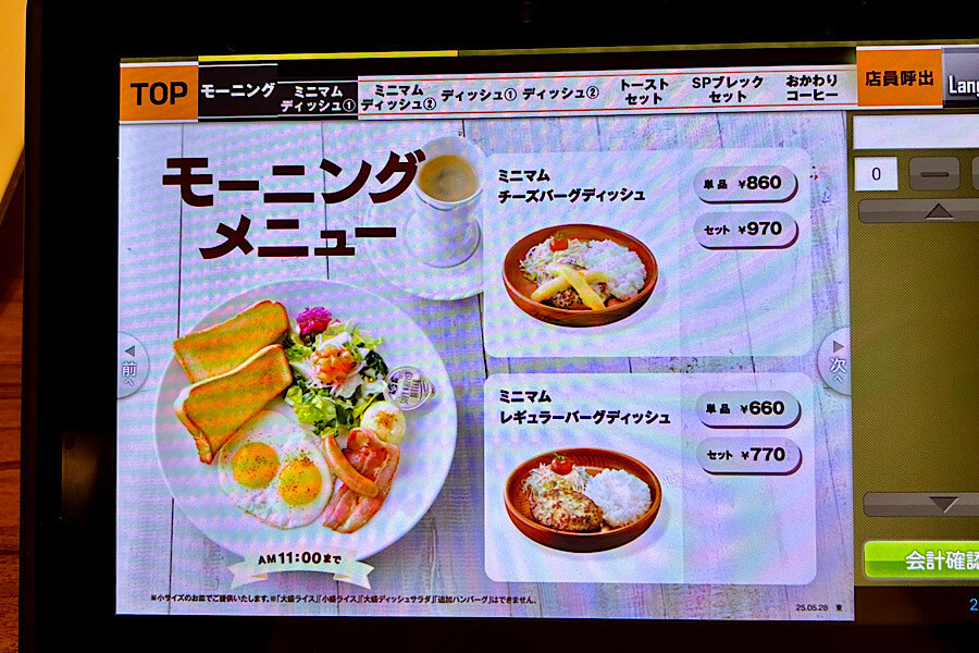 今回は「ミニマムバーグディッシュセット」にしてみました。ちなみに、モーニングの時間帯でもレギュラーサイズの注文はできます。