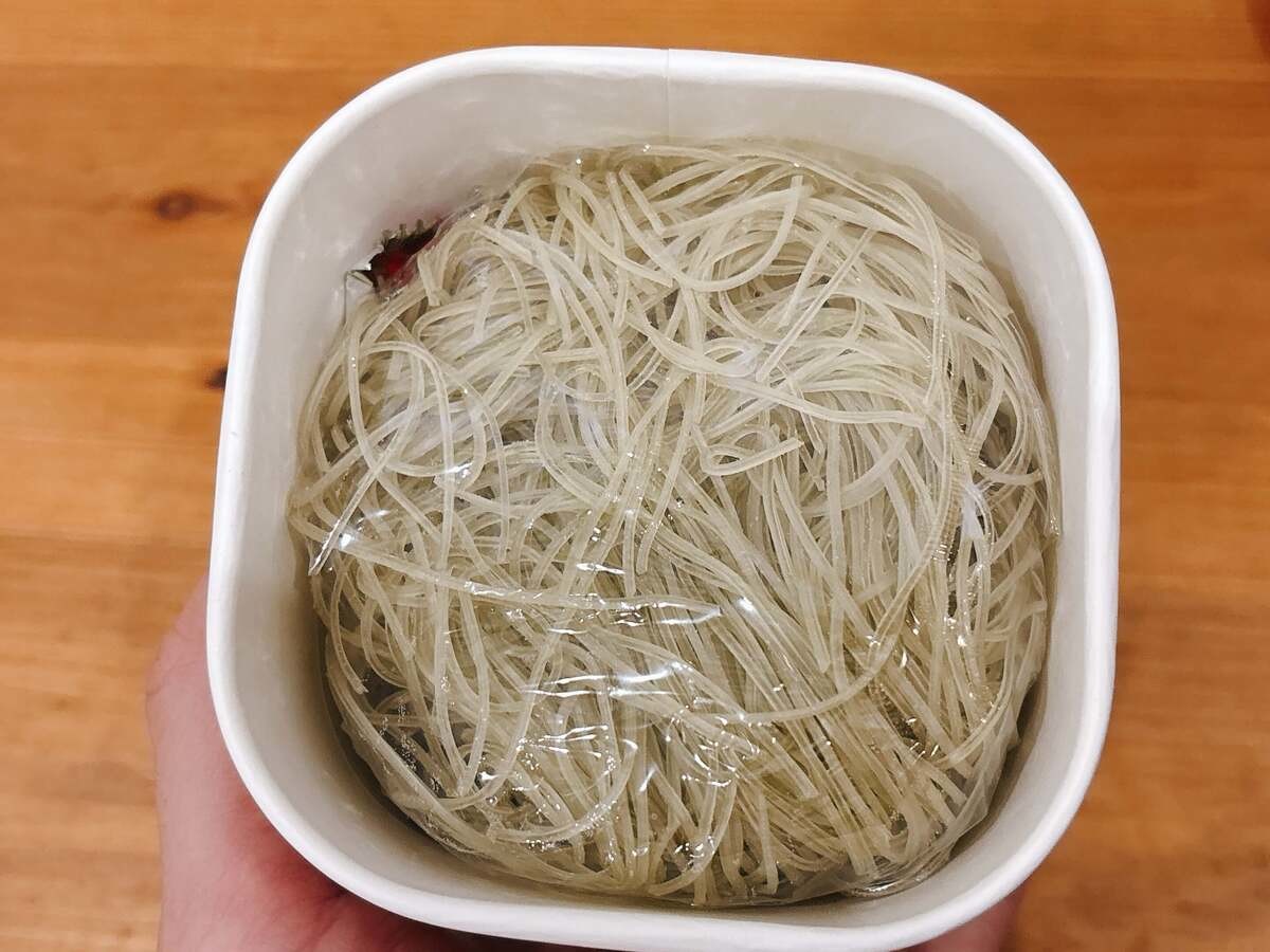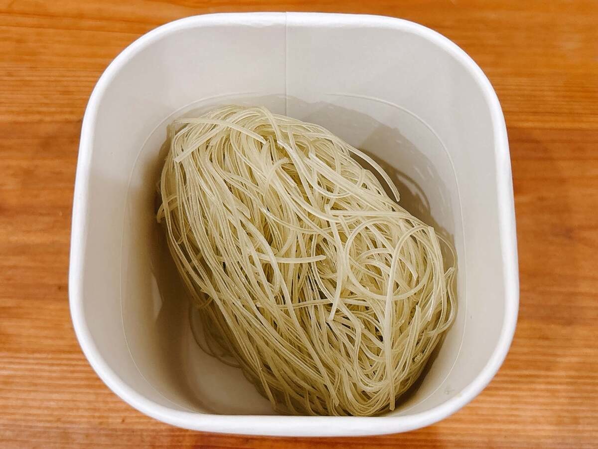 早速つくってみましょう。まずは容器に麺をいれます。