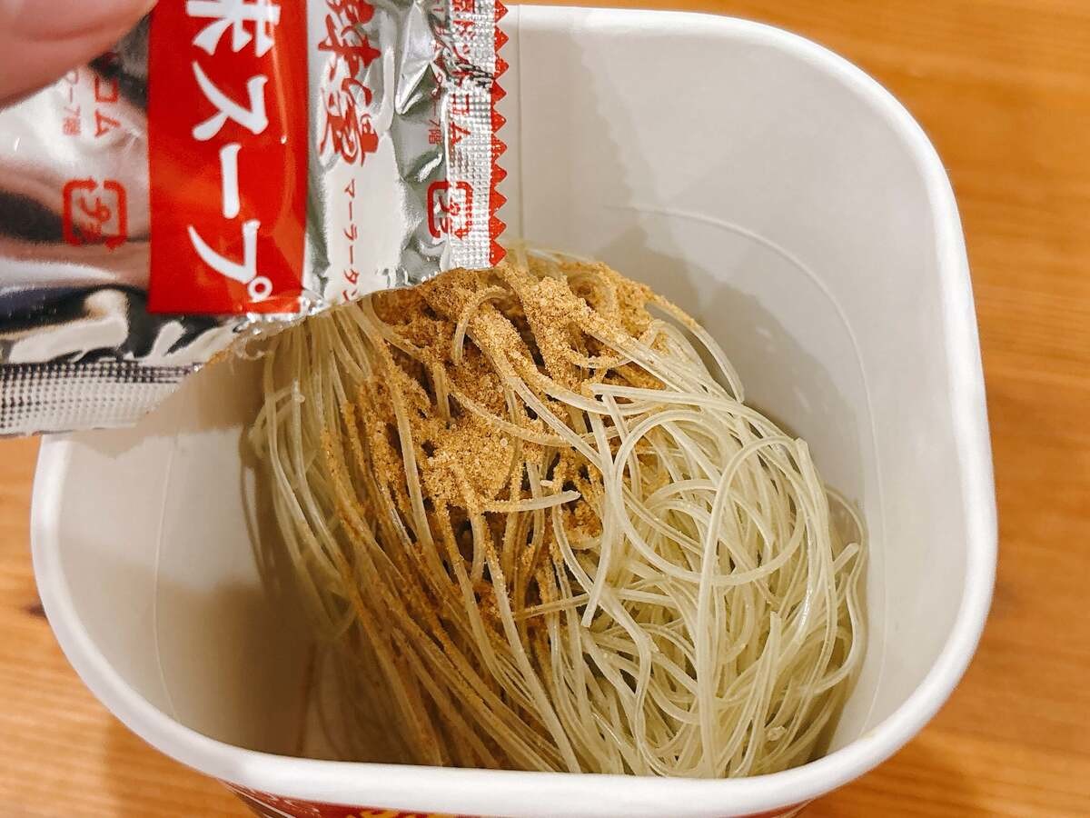 その後、粉末スープとかやくをいれます。