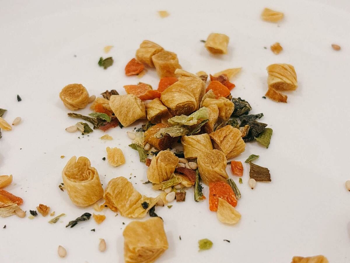 この商品には、にんじん、チンゲン菜、キャベツ、青ねぎ、ごま、湯葉が含まれています。