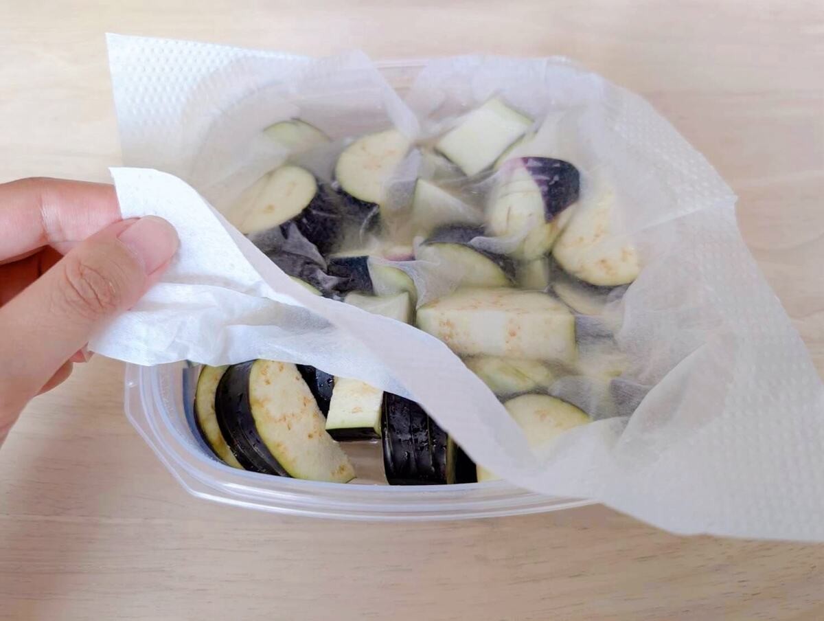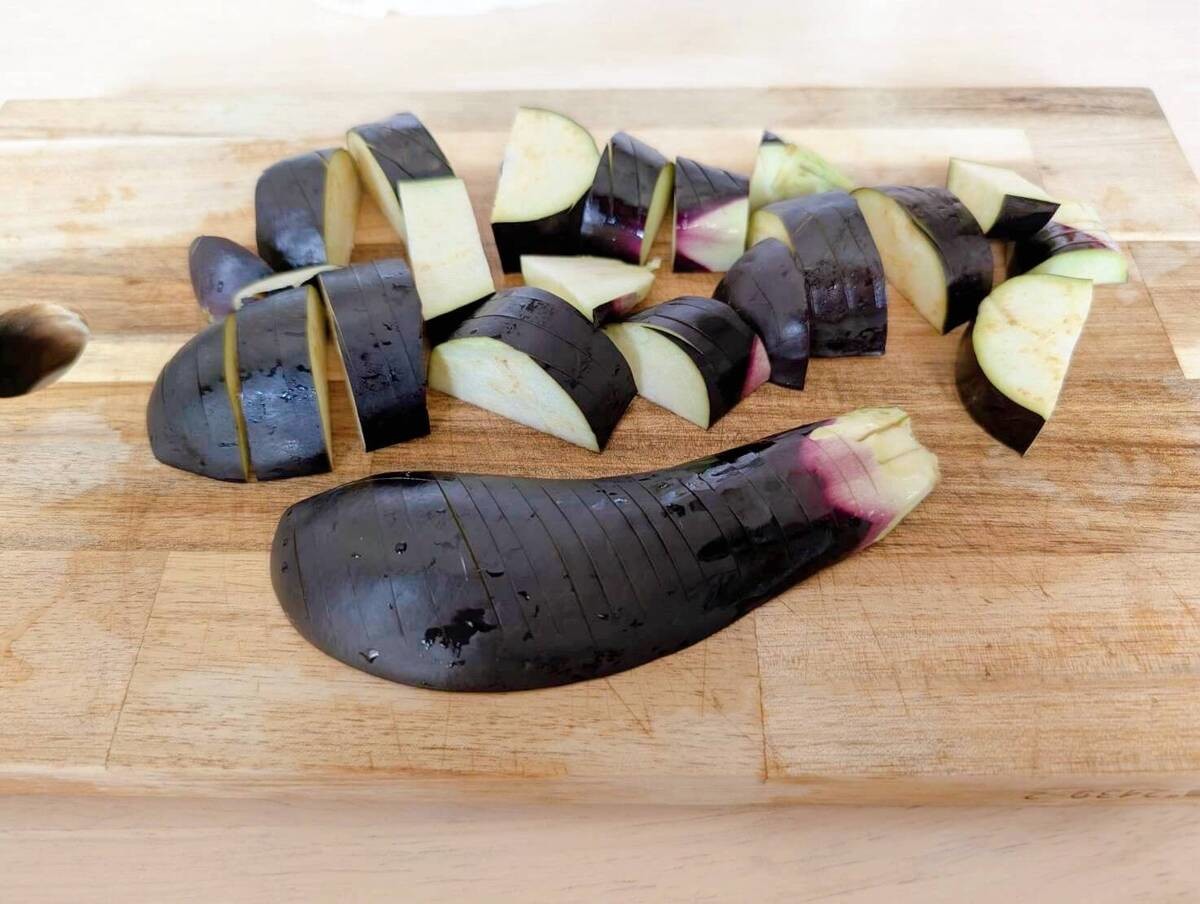 作り方①ナスを切って水につける