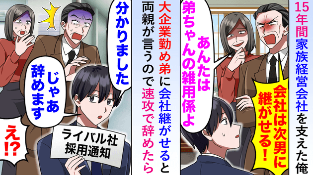 15年家族の会社を支えた俺に「エリート弟に継がせる!お前は雑用w」両親から非道な宣告!→即退職した結果…