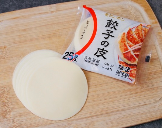 まず、餃子の皮を並べます。しそを洗って水気を拭いてからその上におきます。