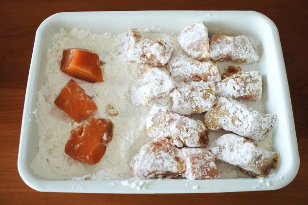 下味をつけた鮭に衣をまぶします。