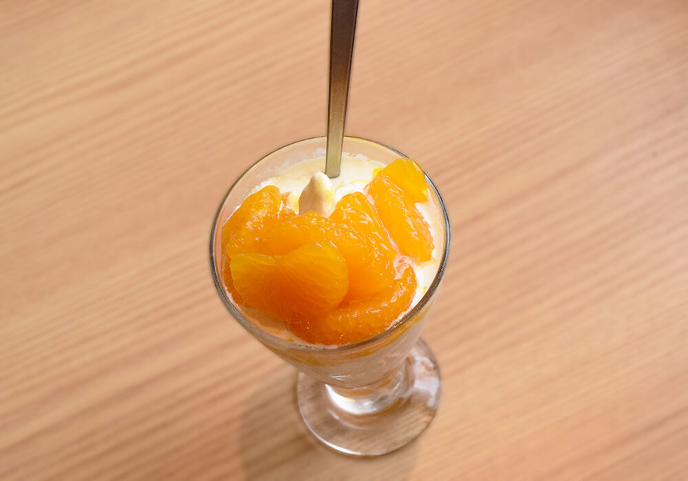 みかん・ソフトクリーム・みかん、と3層に分かれていますよ。小さめのパフェですが、ラーメンを食べ終えた後にはちょうどいいサイズ感です。