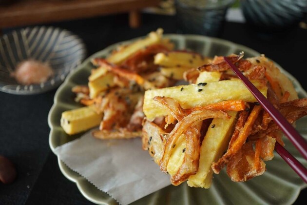 さつま芋はホクホク、野菜はカリカリ、ちくわはやわらかくといろいろな食感が楽しめますよ。