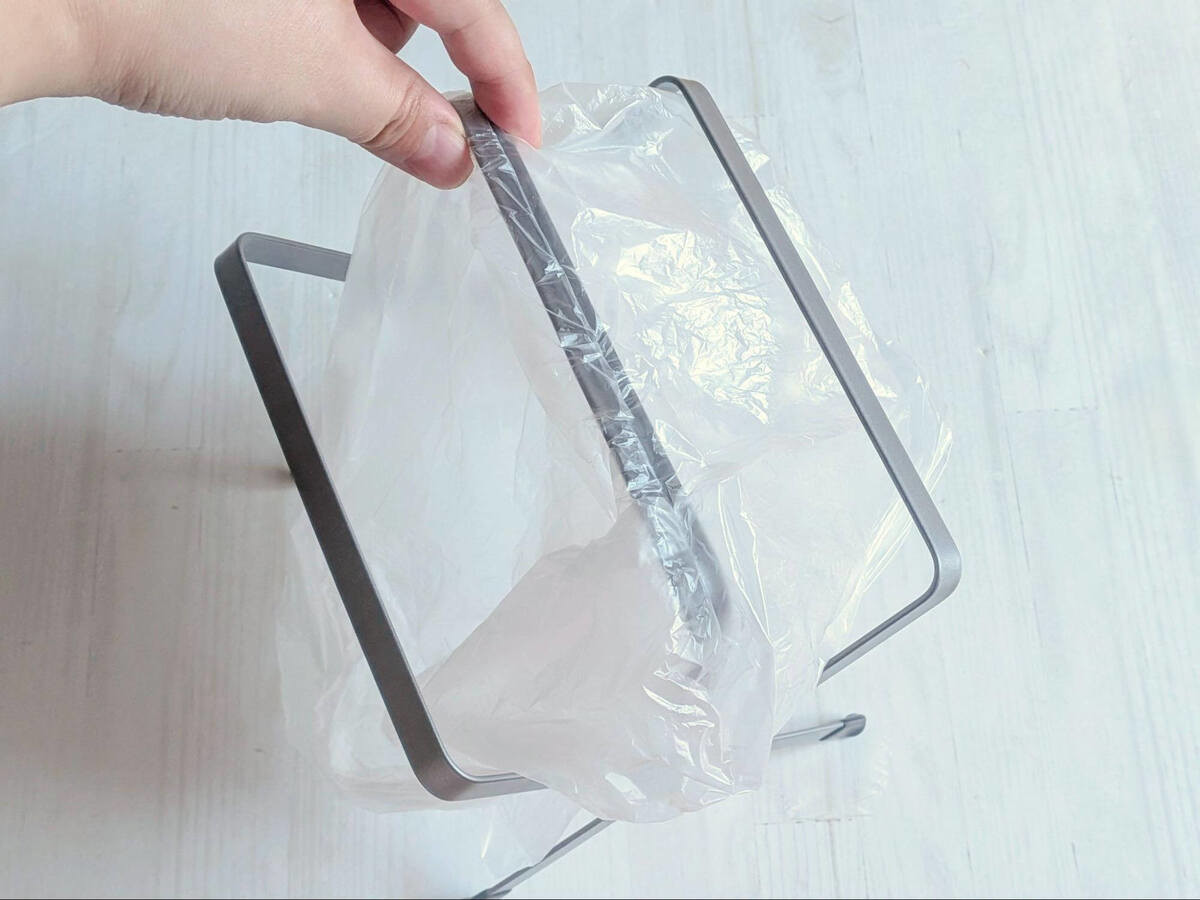 そんな時に便利なのがこのダストホルダー。ポリ袋をセットすれば、簡易的なゴミ箱に変身するんです。