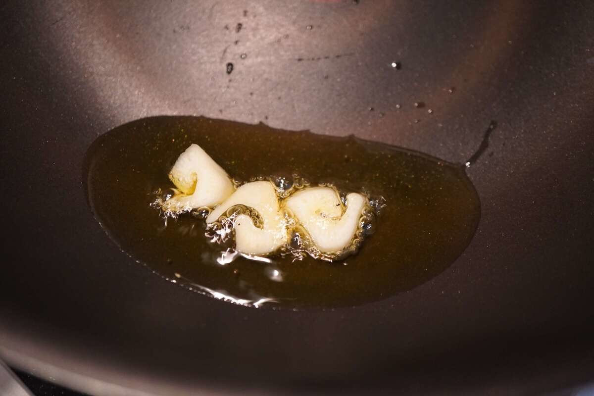 フライパンにオリーブ油を入れ、フライパンを傾けてにんにくを加えます。