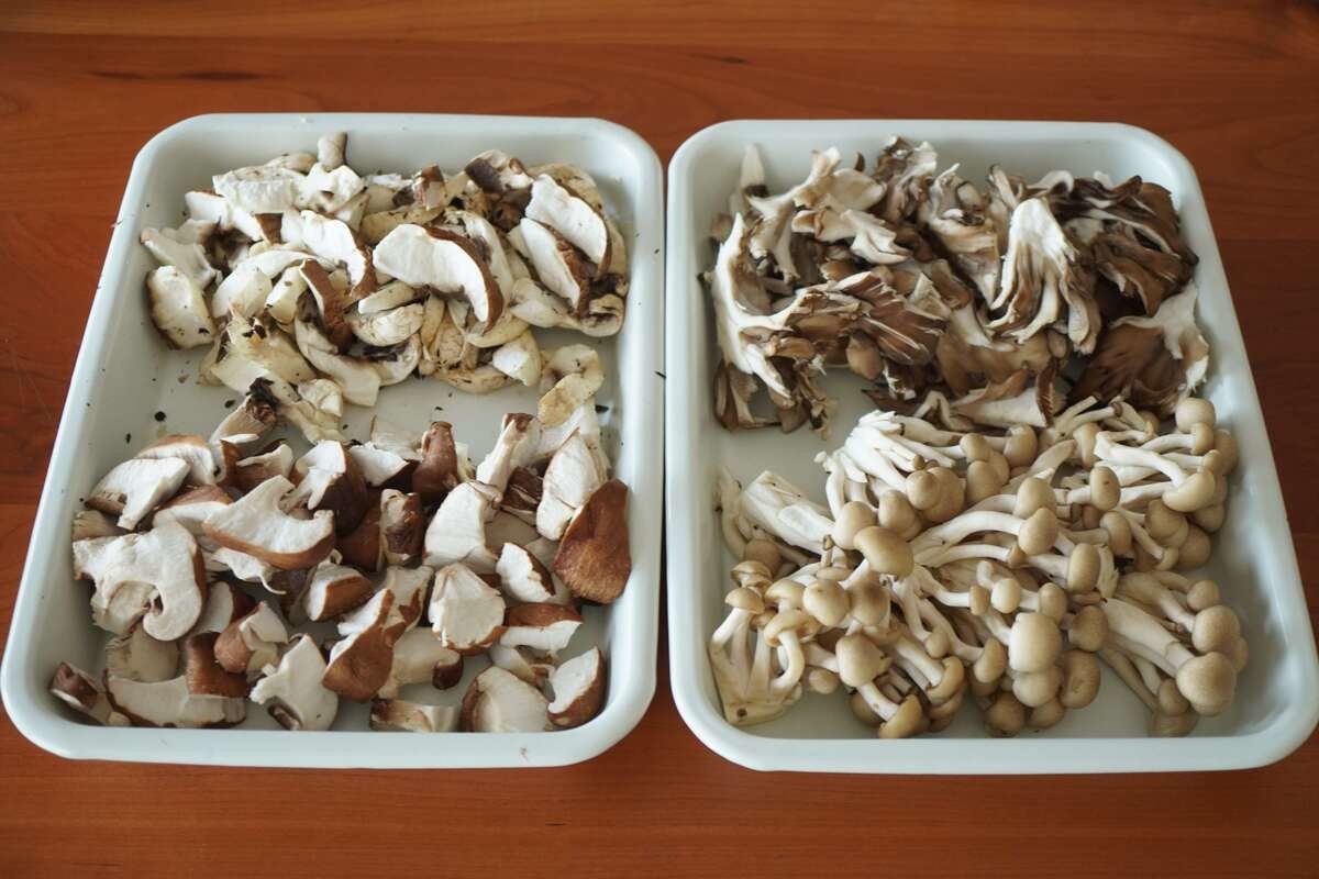 生しいたけは石づきを除き、まいたけとともに手で小さめにさきます。