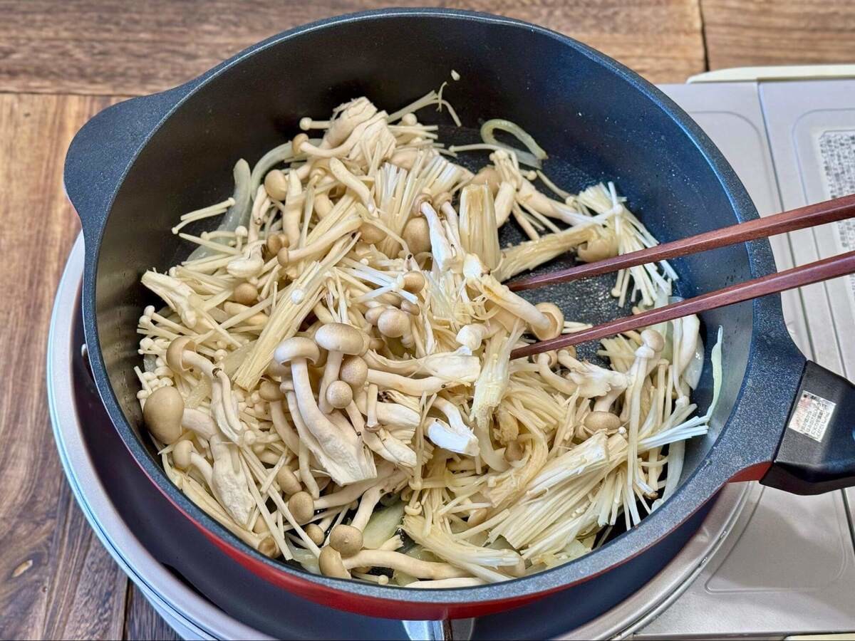 玉ねぎがしんなりしてきたら、えのきとしめじを入れて、さっと炒めます。