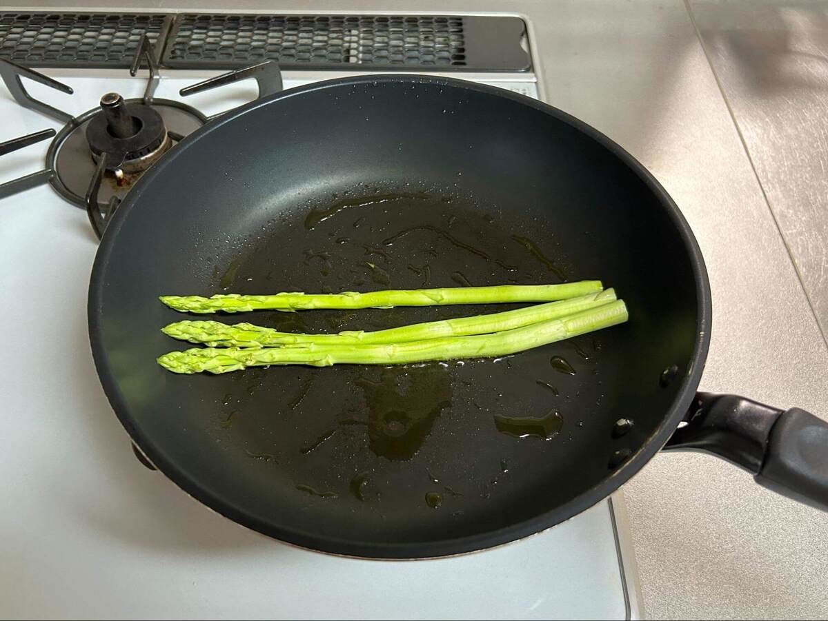 熱したフライパンにオリーブオイルをひき、アスパラを焼きます。