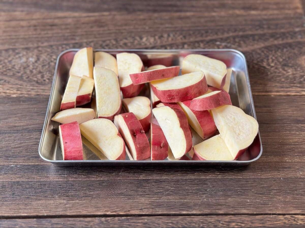 さつまいもは、皮付きのままよく洗います。縦半分にして、1cm幅に切りましょう。