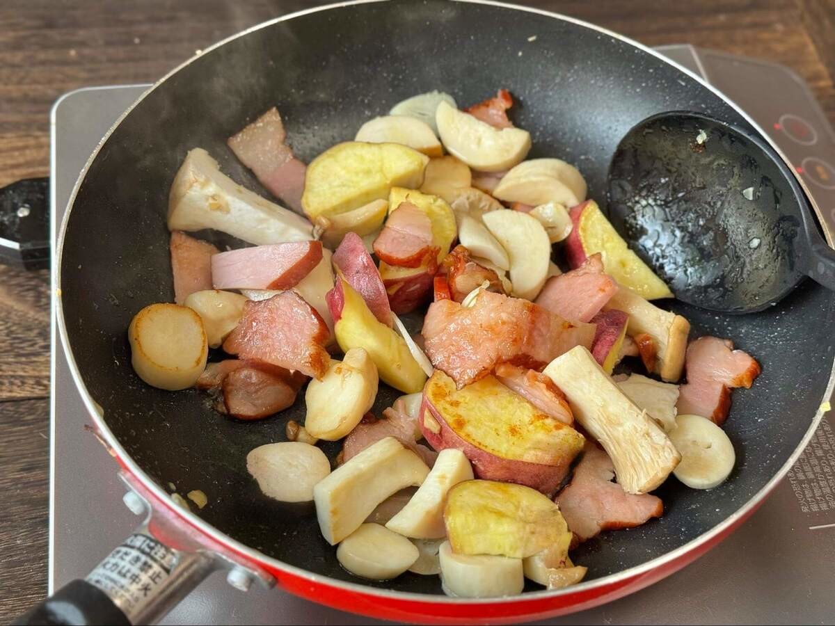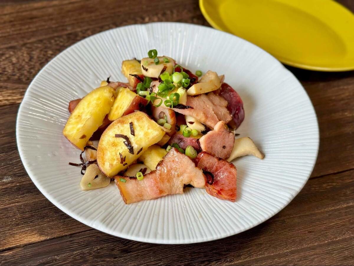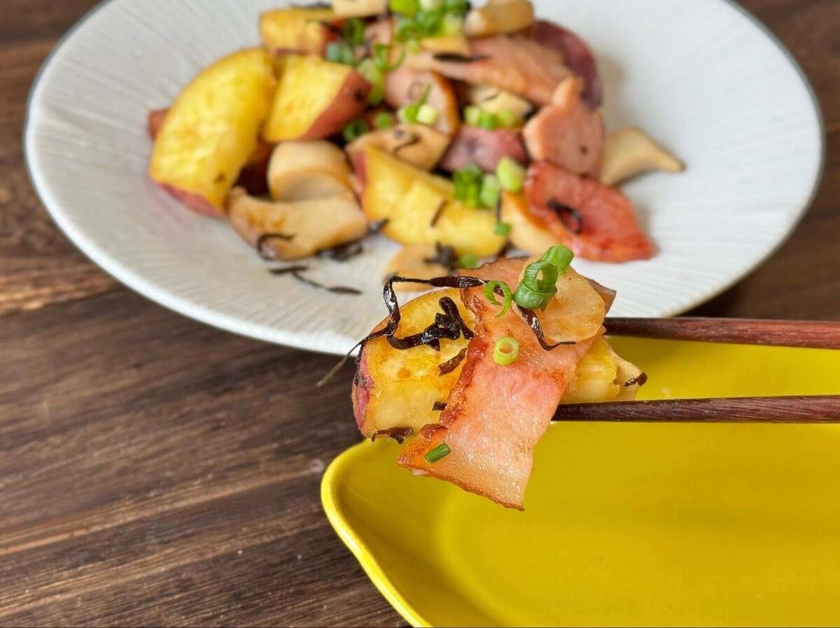 食べてみると、ベーコンの旨みがさつまいもの表面によくしみ込んでいて、さらにご飯に合う味わいに。