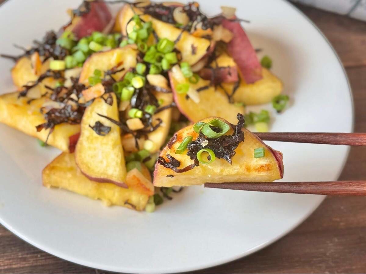 さつまいものほっこりとした甘みに、塩昆布の旨みとガーリックバター風味が合わさることで、ご飯の進む味わいに仕上がっているんです。