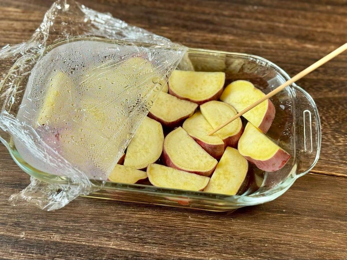 さつまいもの水気を切り、耐熱皿に移してラップをかけます。600Wの電子レンジで3分加熱します。