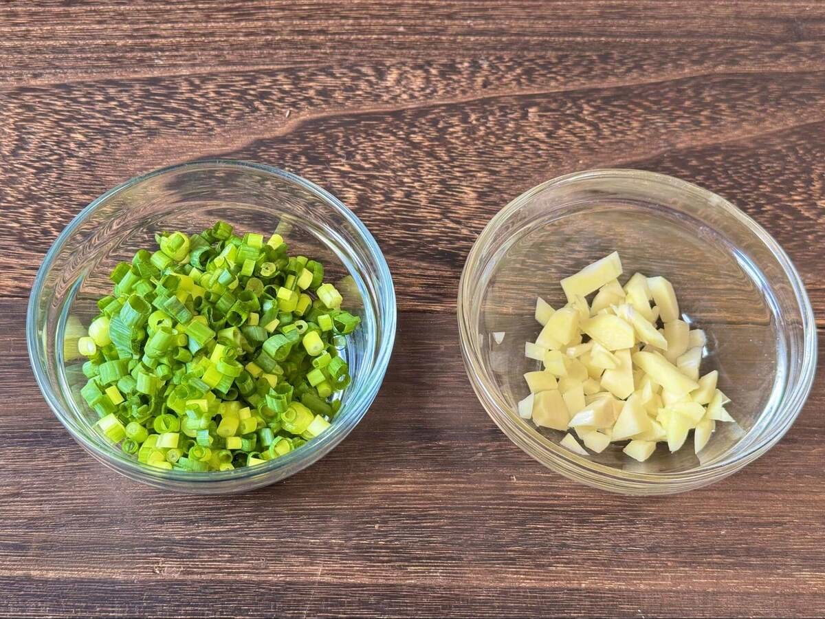 万能ねぎは小口切りにして、ニンニクは粗みじん切りにしておきます。