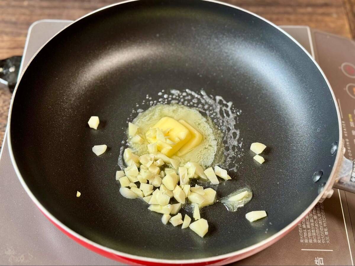 フライパンを火にかけ、熱くなる前にバターとニンニクを入れて香りを立たせます。