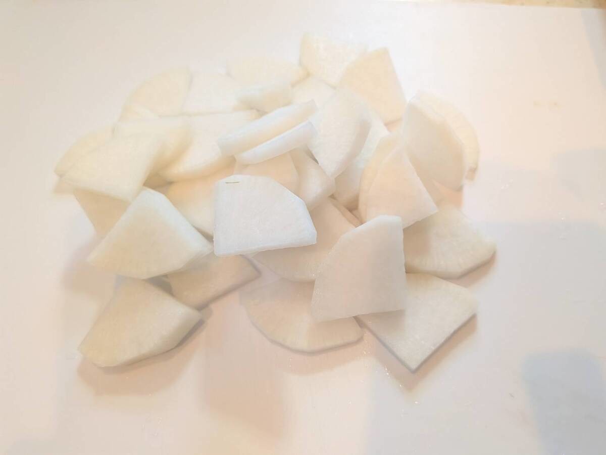 大根は皮をむいて5mm厚さのいちょう切りにします。