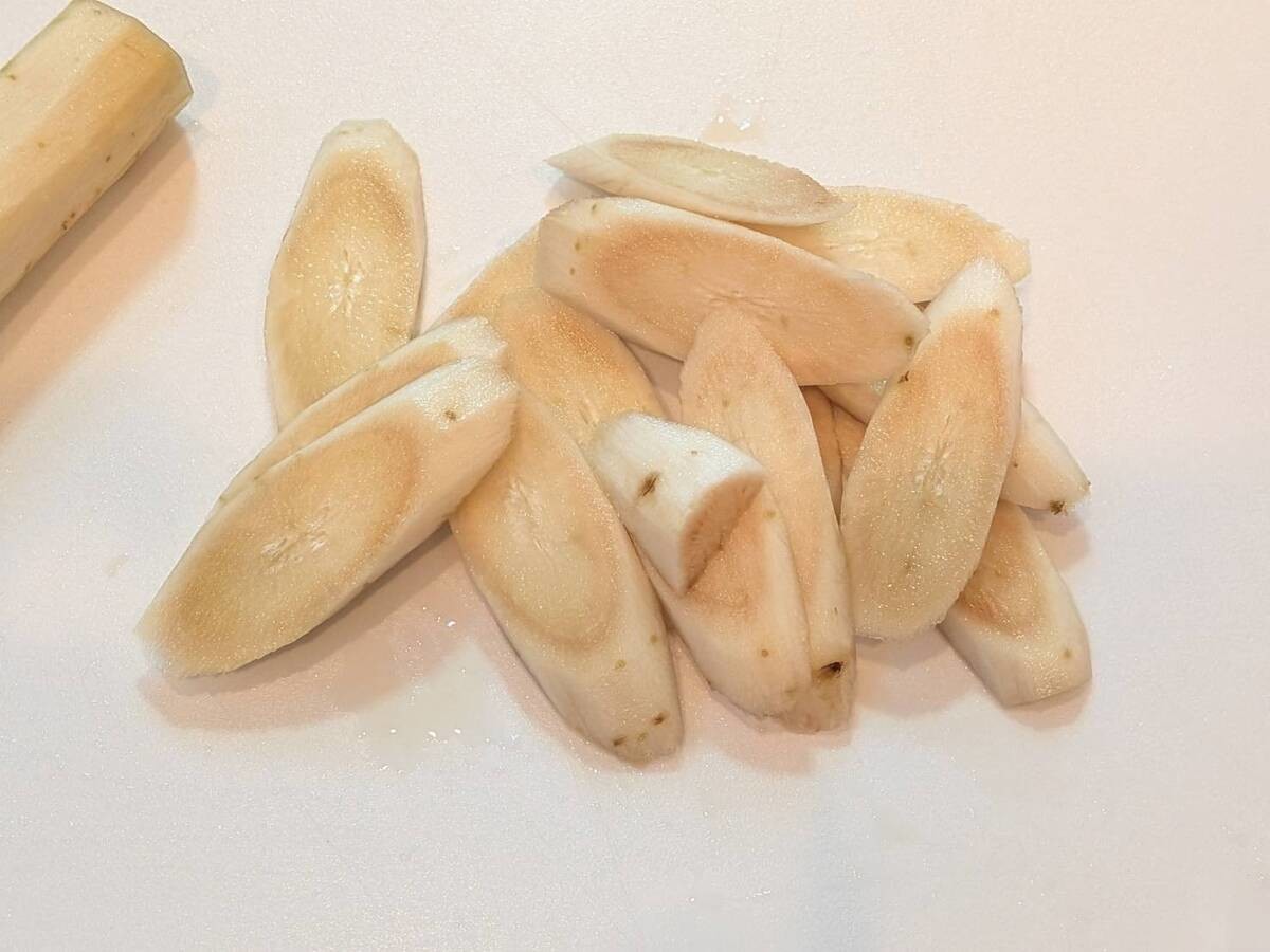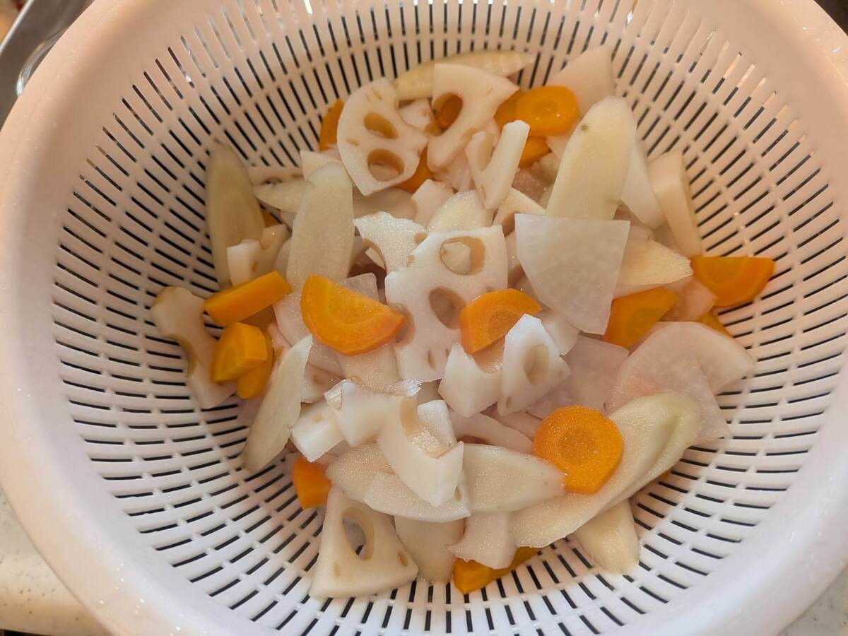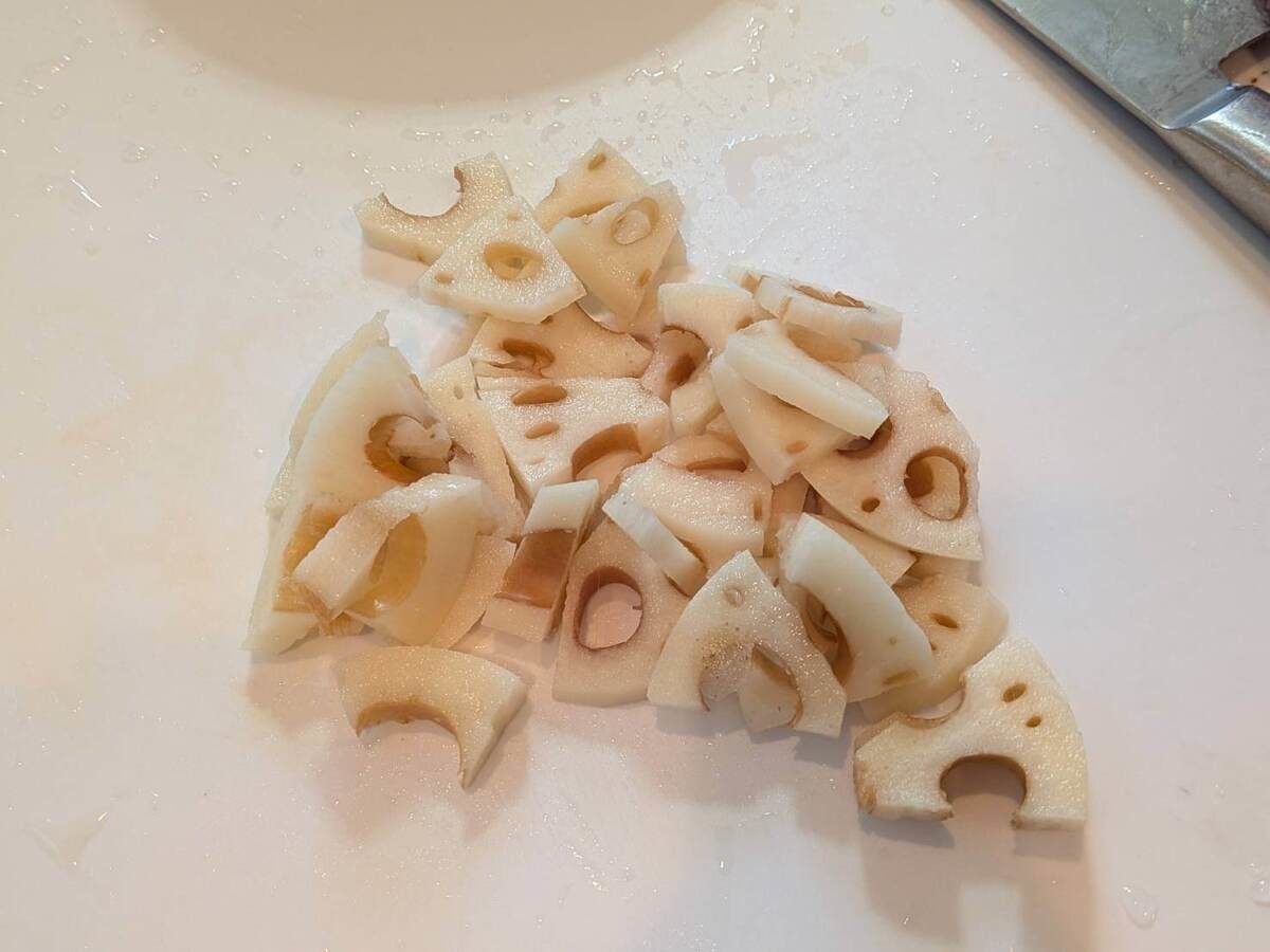 れんこんは皮をむき、5mm厚さのいちょう切りにします。