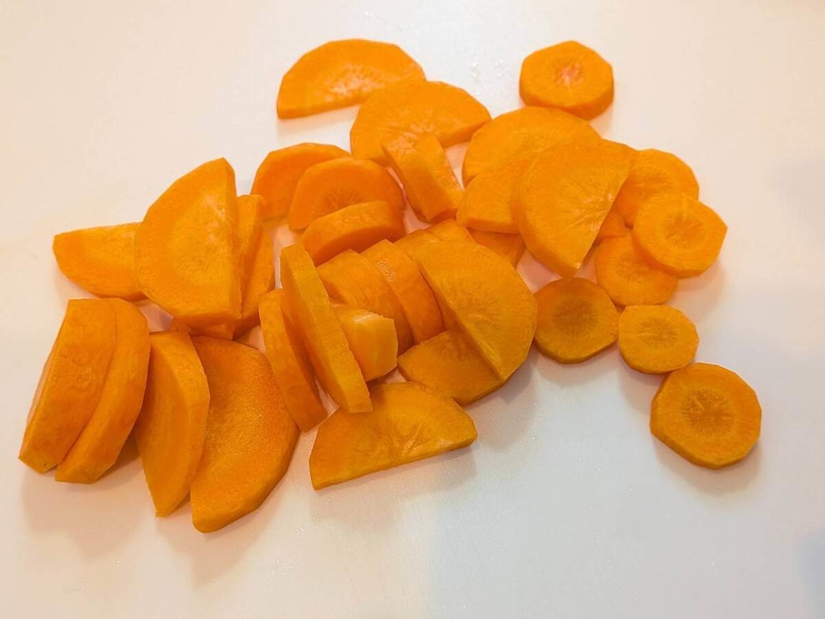 にんじんはよく洗い、皮ごと5mm厚さの半月切りにします。