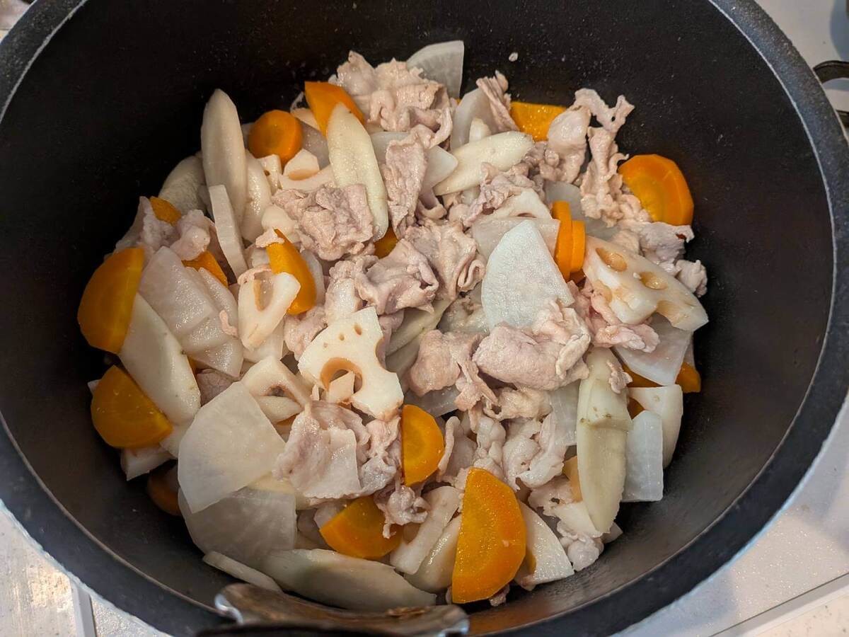 根菜のシャキホクと豚バラ肉のジューシーさで、おなかも満足。副菜少なめの日にメインにしても十分なボリュームです。