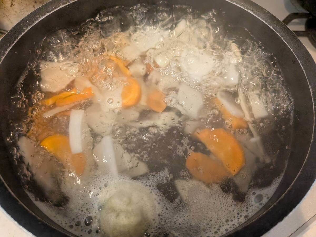 鍋に水(分量外)と大根、にんじん、ごぼう、れんこんを入れて強火にかけます。