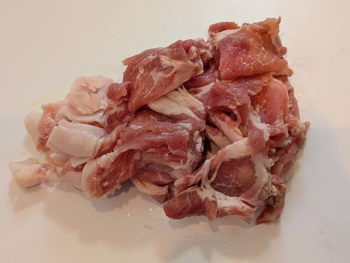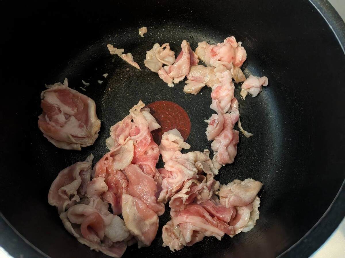 別の鍋にごま油を入れて中火で熱し、豚肉を炒めます。