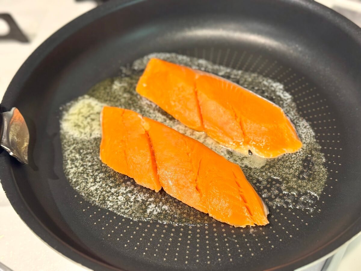 鮭に骨がある場合は、先に取り除いておきます(今回筆者は骨取り済みの鮭を使用しました)。