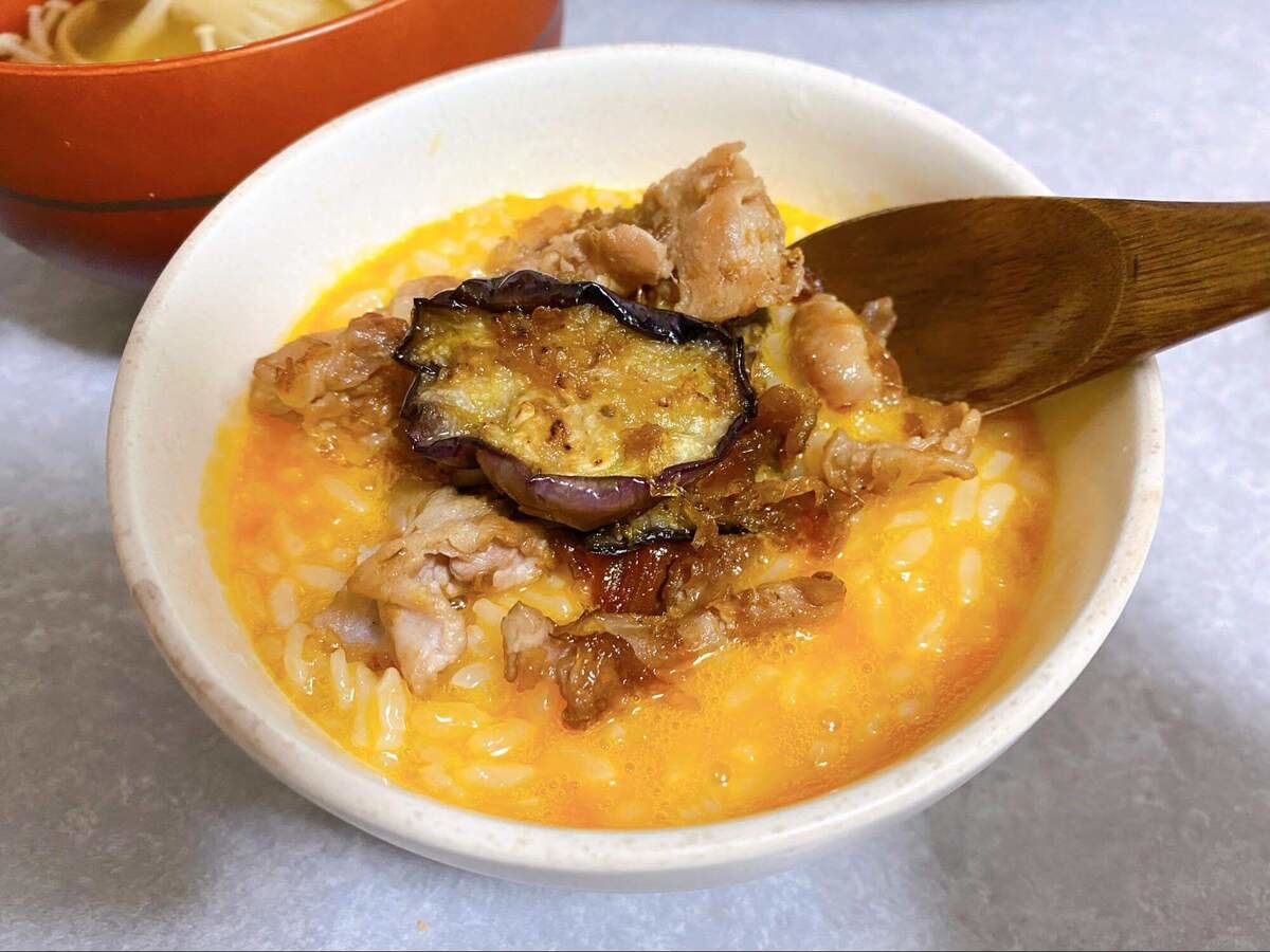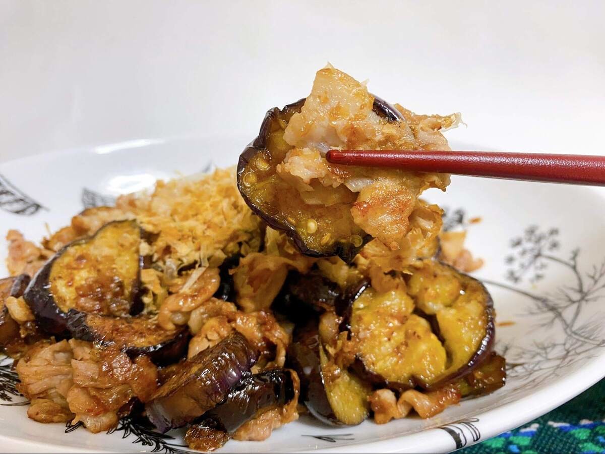 一口運べば、ガツンとしたしょうゆとごま油の風味が広がって、なすと豚肉、おかかを一緒に食べると静かに旨みが爆発!無意識のうちにご飯をパクパク……。