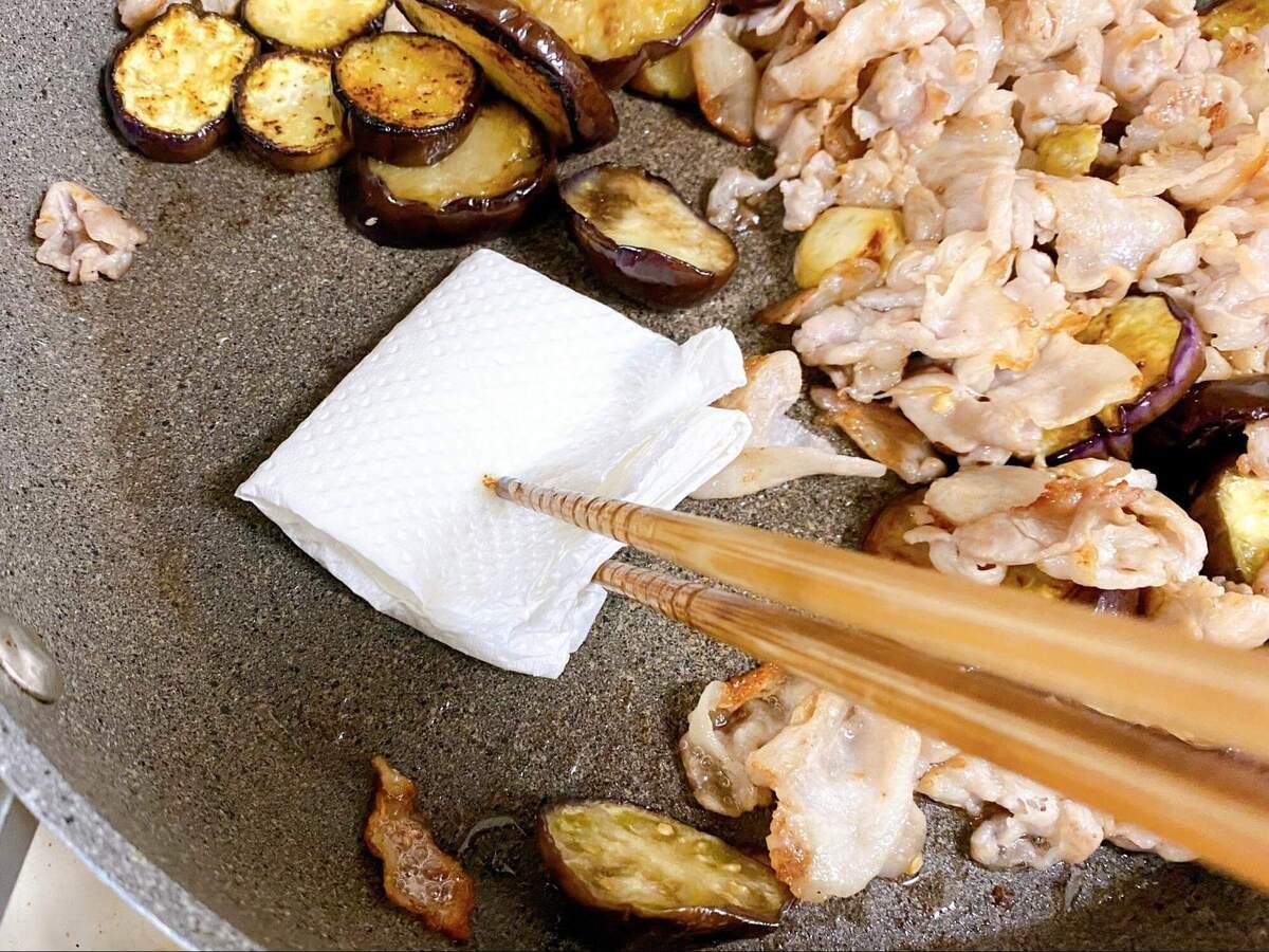調味料を加える前に油を拭き取ることで、味が絡みやすくなります。