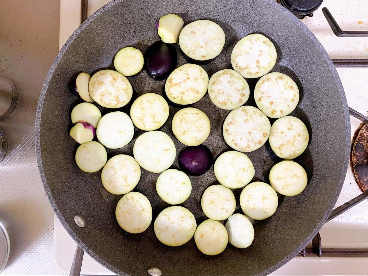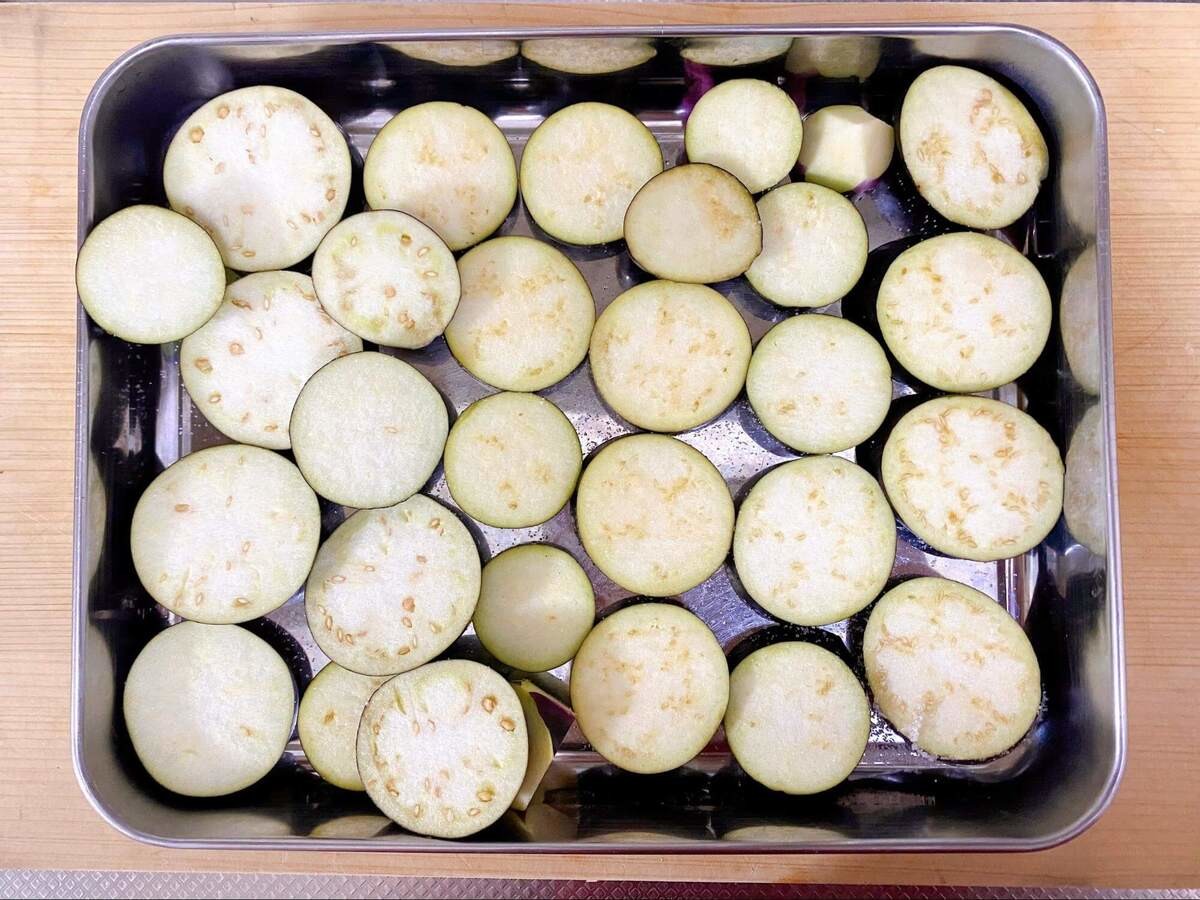 なすはヘタを除き、1cm厚さの輪切りにします。