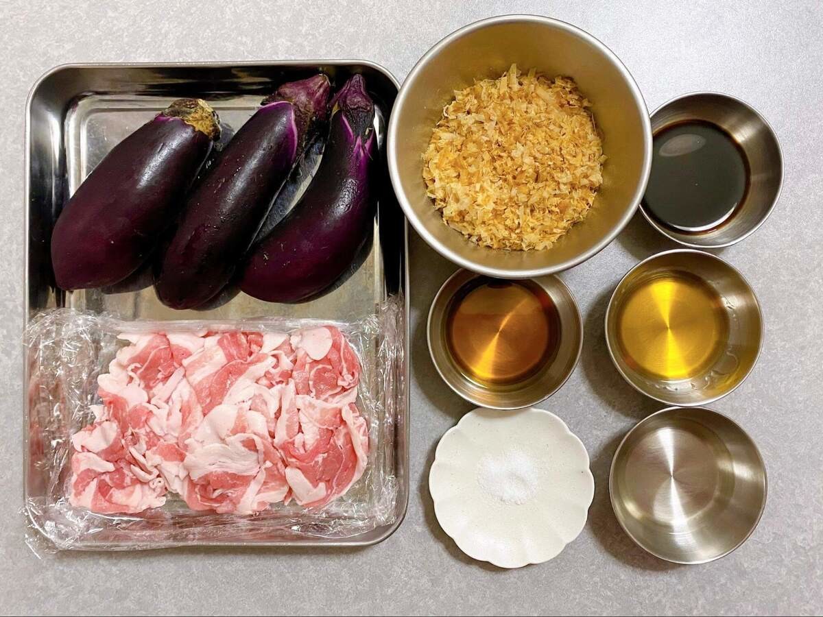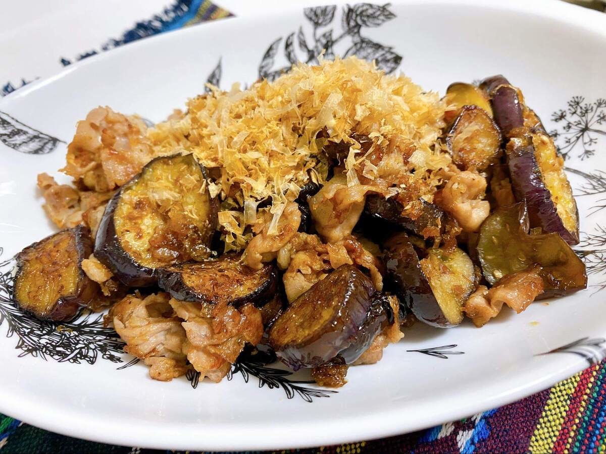 なすと豚バラを、削り節としょうゆベースで味をつけるシンプルなレシピです。